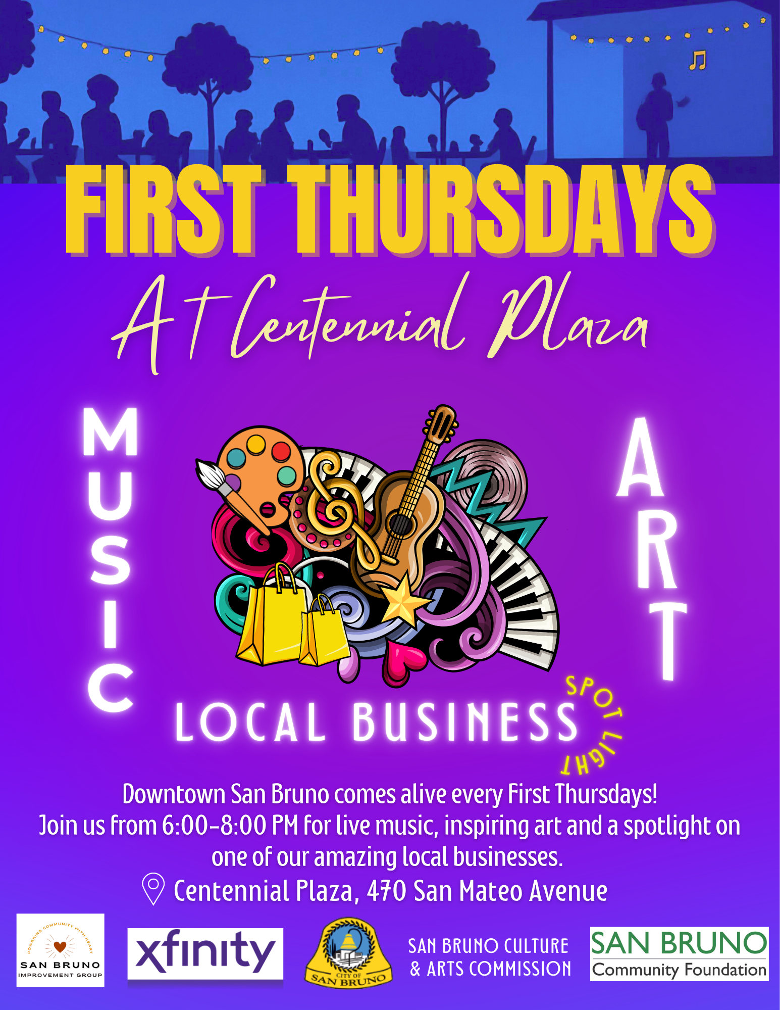 Join us in at Centennial Plaza on the first Thursday of every month for First Thursdays — an evening that spotlights the best of downtown San Bruno.